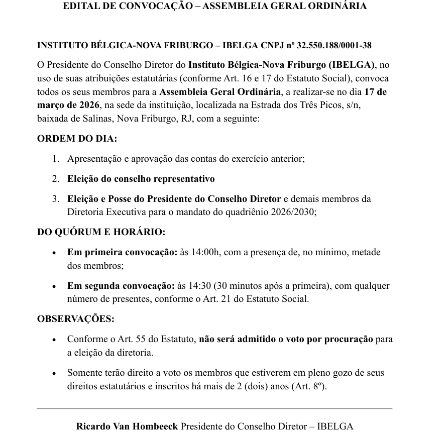 INSTITUTO BÉLGICA-NOVA FRIBURGO – IBELGA CNPJ nº 32.550.188/0001-38 O Presidente do Conselho Diretor do Instituto Bélgica-Nova Friburgo (IBELGA), no uso de suas atribuições estatutárias (conforme Art. 16 e 17 do Estatuto Social), convocou todos os seus membros para a Assembleia Geral Ordinária, a realizar-se no dia 17 de março de 2026, na sede da instituição, localizada na Estrada dos Três Picos, s/n, baixada de Salinas, Nova Friburgo, RJ, com o seguinte: ORDEM DO DIA: 1. Apresentação e aprovação das contas do exercício anterior; 2. Eleição do conselho representativo 3. Eleição e Posse do Presidente do Conselho Diretor e demais membros da Diretoria Executiva para o mandato do quadriênio 2026/2030; DO QUÓRUM E HORÁRIO: Em convocação: às 14:00h, com a primeira presença de, no mínimo, metade dos membros; Em segunda convocação: às 14h30 (30 minutos após a primeira), com qualquer número de presentes, conforme o Art. 21 do Estatuto Social. OBSERVAÇÕES: Conforme o Art. 55 do Estatuto, não será admitido o voto por procuração para a eleição da diretoria. Somente terão direito ao voto os membros que estiverem em pleno gozo de seus direitos estatutários e inscritos há mais de 2 (dois) anos (Art. 8º). Ricardo Van Hombeeck Presidente do Conselho Diretor – IBELGA